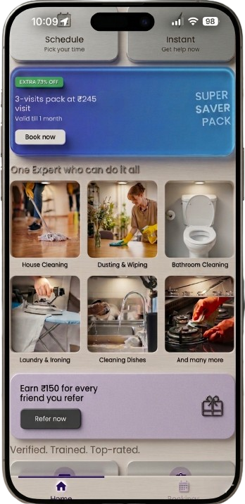 Book trusted home services instantly. From cleaning to repairs, our professionals deliver fast, reliable and affordable solutions right at your doorstep.